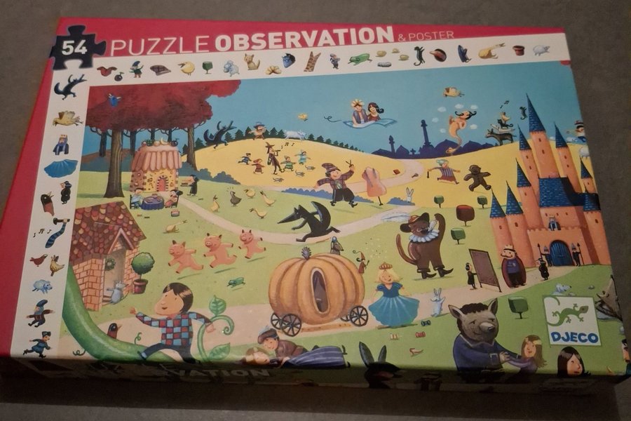 Ett roligt pussel från Djeco. Spridda över en stor bild finns mängder av figurer och föremål från olika sagor att upptäcka. Poster medföljer och samtliga 54 bitar finns med. Från 4 år.