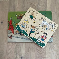 Pussel med Pippi Långstrump-motiv. Pusslet har 24 bitar och är tillverkat av kartong. Måtten är 35 x 28 cm.