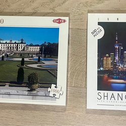 En pusselkartong är sliten i hörnet men alla pussel är fina.