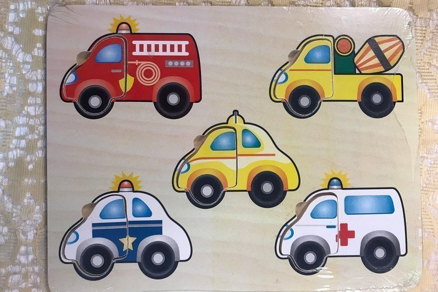 Träpussel med olika fordon. Perfekt för barn som älskar bilar och att lära sig olika fordon.
