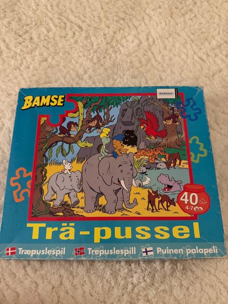 Träpussel med Bamse-motiv. Pusslet har 40 bitar och rekommenderas för åldrarna 4-7 år. Tillverkat av Egmont Kärnan.