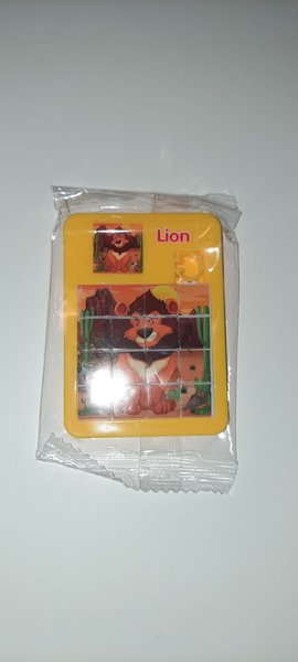 Skjutpussel med lejonmotiv. Pusslet är i plast och har en bild av ett lejon i ökenlandskap.