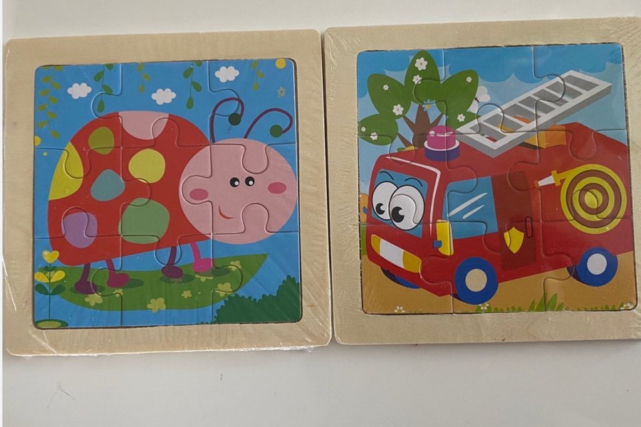 Två träpussel för barn. Pusslen har färgglada motiv och är tillverkade av trä. 3 år +