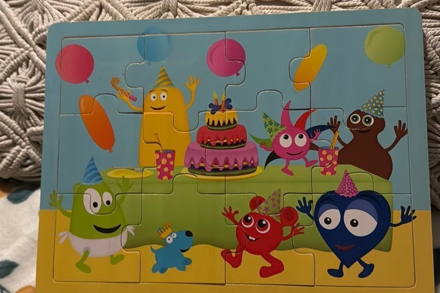 Pussel med färgglada figurer och ballonger. Pusslet har en bild av en födelsedagsfest med tårta och glada karaktärer. (babblarna)