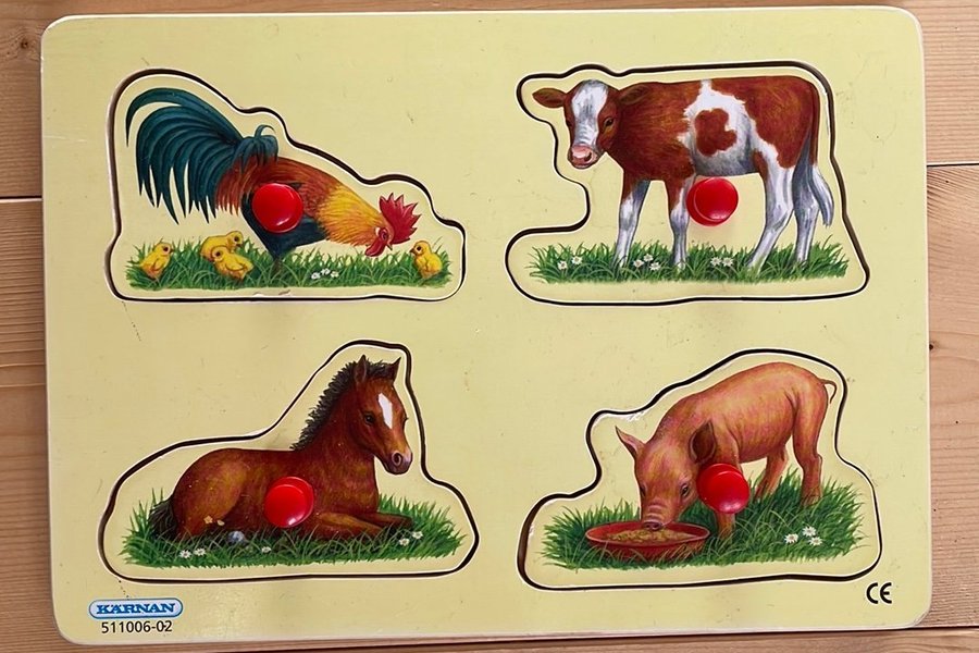 Träpussel med knoppar från Karnan. Pusslet har motiv av bondgårdsdjur: en tupp med kycklingar, en kalv, en häst och en gris. Varje pusselbit har en röd knopp för enkel hantering.