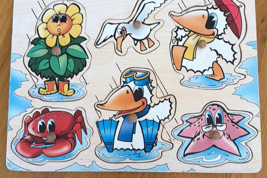 Träpussel med sex olika figurer. Varje pusselbit har en knopp för enklare hantering. Pusslet har motiv av en blomma, en mås, en anka med paraply, en krabba, en anka med dykarutrustning och en sjöstjärna.
