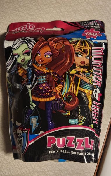 Pussel med Monster High-motiv. Pusslet har 150 bitar och måtten 38.1 cm x 28.5 cm. Levereras i en återförslutningsbar påse för enkel förvaring.