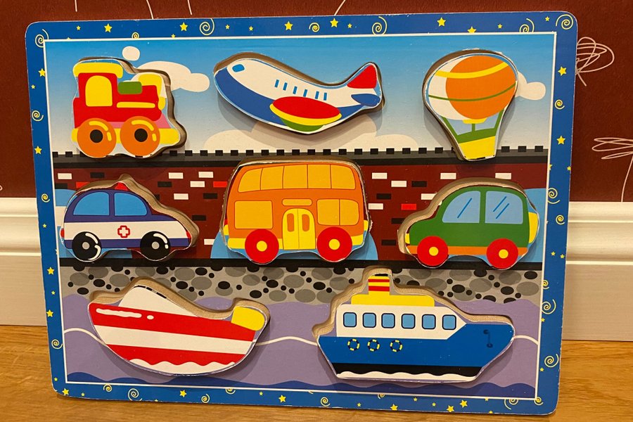 Säljer ett träpussel med motiv av olika fordon. Pusslet innehåller åtta olika fordonsbitar, inklusive tåg, flygplan, luftballong, ambulans, buss, bil, segelbåt och färja.