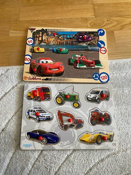 Två träpussel med fordonsmotiv. Ett pussel har motiv från Disney Pixar Cars med Blixten McQueen och andra racerbilar. Det andra pusslet innehåller olika fordon som polisbil, traktor, lastbil, motorcykel, grävmaskin och sportbilar.