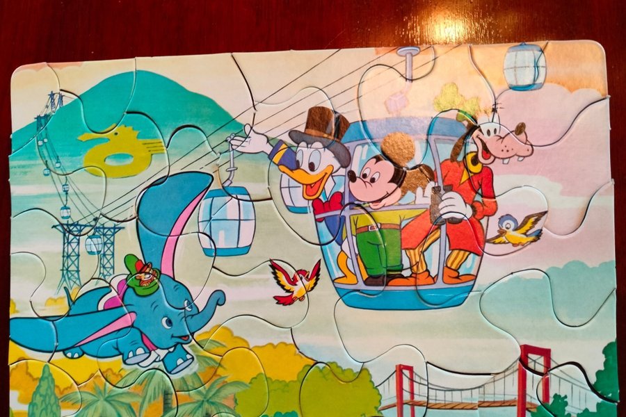 Pussel med Disney-motiv. Föreställer Musse Pigg, Kalle Anka, Långben och Dumbo i en scen med linbana och bro. bitar av papp