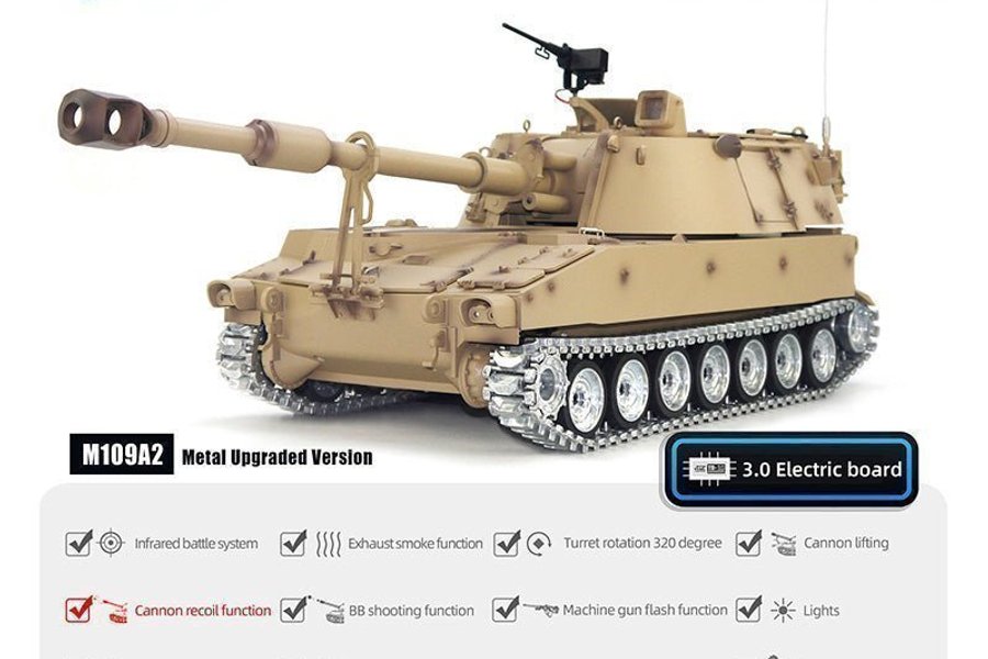 M109A2 modell med uppgraderad metallversion. Den har infrarött stridssystem, avgasrökfunktion och 320 graders rotation av kanonen. Kanonen kan hissas och har en rekylfunktion. Den har även BB-skjutfunktion, maskingevärsfunktion och ljus. Blinkers, alla metallhjul (drivhjul, tomgångshjul, väghjul, band). Stöldrivsystem, fullt kullagerstöd, justerbar bandspänning och fordonets ljudemulering. Innesluten metalllåda, torsionsfjädring och hjul med silikongummi.