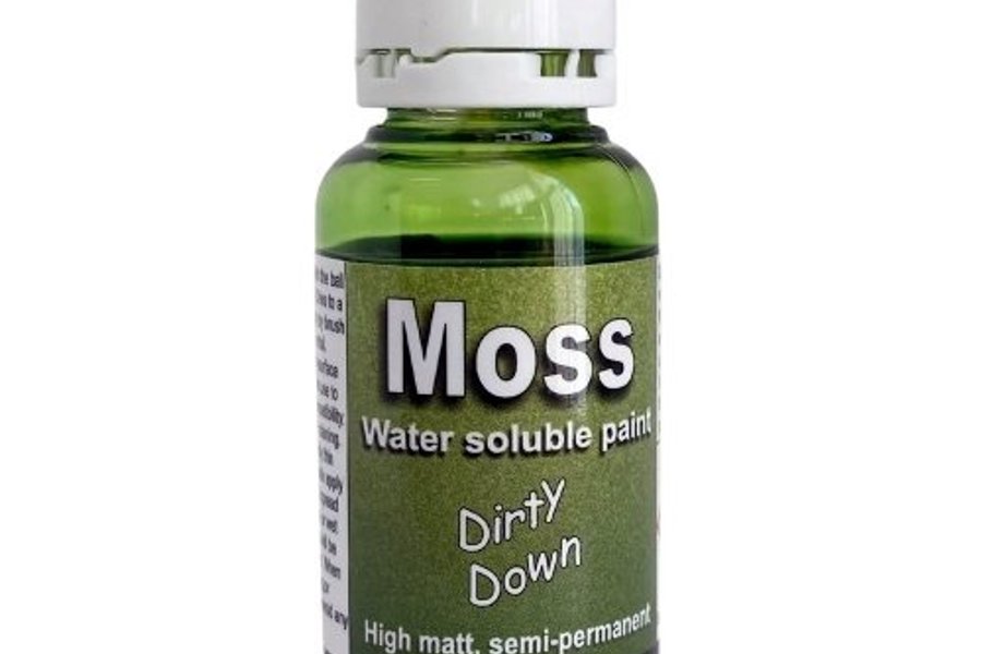 Den mörkfärgade vätskan torkar till en högmatt mossfärg på 1 till 5 minuter beroende på temperaturen. Applicera mossfärg med pensel eller airbrush/spruta. Mosseffektfärg ser bäst ut när den appliceras på grova, strukturerade ytor. Vi brukade sälja den här produkten under varumärket "Modelmates" Moss Effect - det är samma produkt men nu med Dirty Down på etiketten.