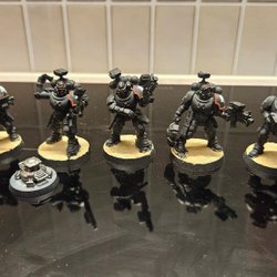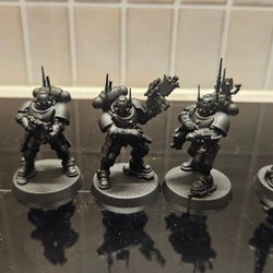 Ett set med Space Marines för Warhammer 40 000, figurerna kommer från Warhammer 40k 3rd edition starter lådan tror jag. Figurerna är grundmålade. En marine saknar sin "ryggsäck".