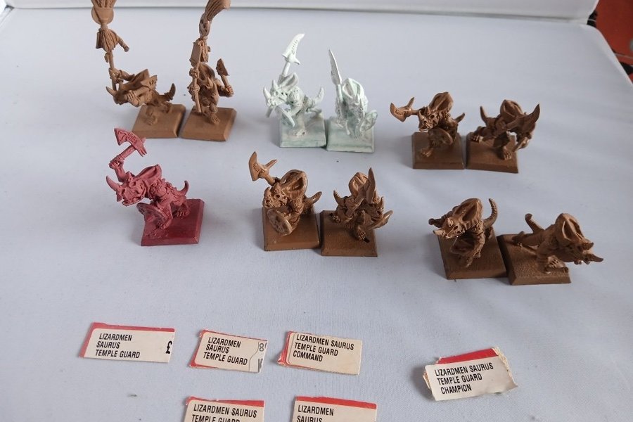 Warhammer Lizardmen Saurus Temple Guard Command & Champion metalfigurer. 11 stk