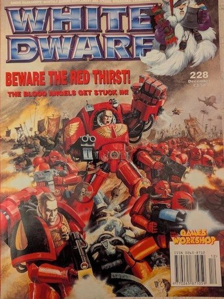 Tidningen White Dwarf nummer 228 från december 1998. Tidningen innehåller "BEWARE THE RED THIRST! THE BLOOD ANGELS GET STUCK IN!".