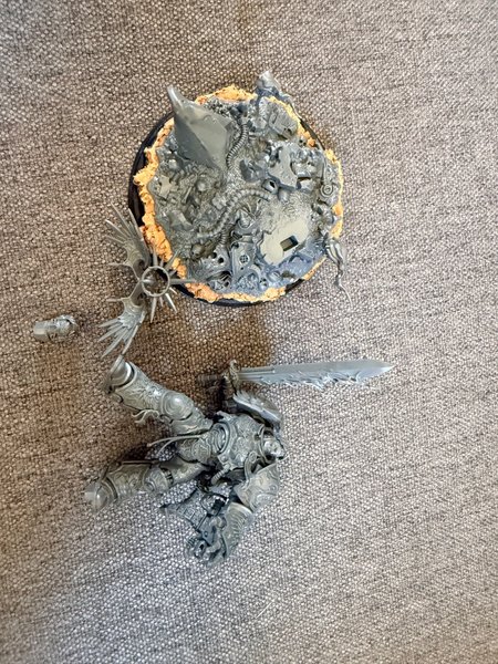 Roboute Guilliman Warhammer 40K figur och bas. Figuren är omonterad och omålad. Basen är delvis monterad och målad i orange och grå nyanser.