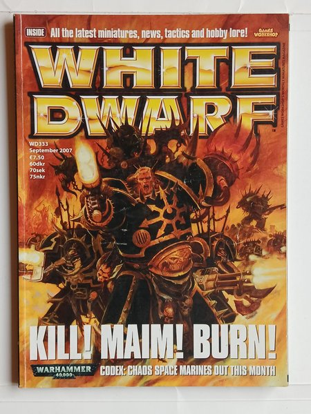 White Dwarf WD333 magasin fra september 2007. Indeholder nyheder, taktikker og hobbyhistorier om Warhammer 40,000, herunder Codex: Chaos Space Marines.