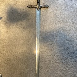 En tavla med ett motiv av en bevingad riddare med svärd.