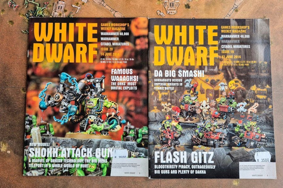 Två nummer av White Dwarf, Games Workshops veckotidning. Nummer 19 och 20 från juni 2014. Innehåller artiklar om Warhammer 40,000, Warhammer och Citadel Miniatures.