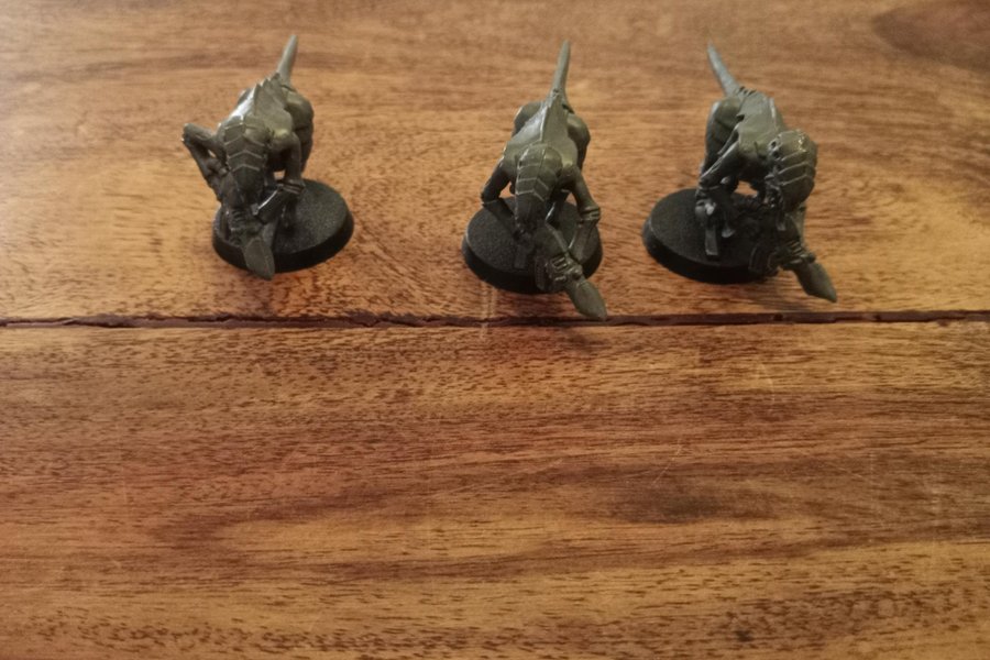 Tre umalede Warhammer 40K Tyranids Hormagaunts figurer. Figurerne er monteret på baser.