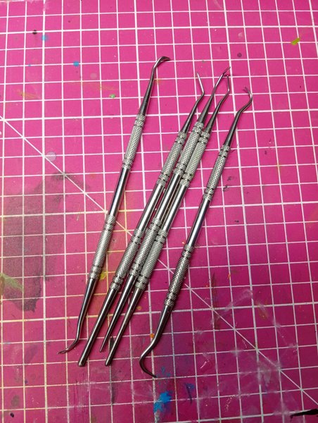 Dessa modelleringsverktyg är tillverkade av metall och har räfflade handtag för ett säkert grepp. Verktygen har olika böjda och spetsiga ändar.
