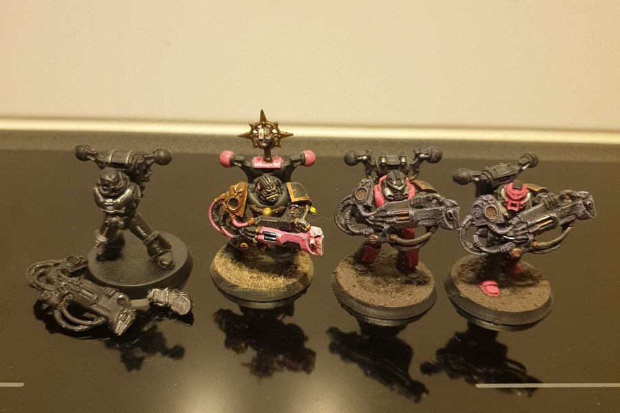Öppen för prisförslag. Fyra stycken chaos space marine csm emperors children noise marines i plast och resin. En har bitar i metall (tenn). 32 mm runda baser medföljer.