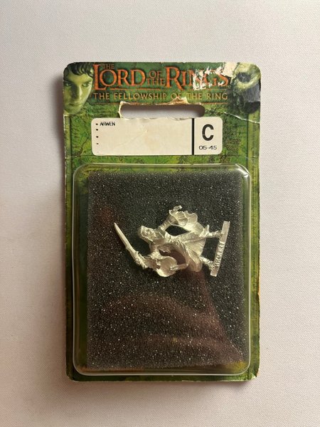 This is a metal miniature figure of Arwen from The Lord of the Rings. The figure is still in its original packaging, which includes a clear plastic blister over a black foam insert.
