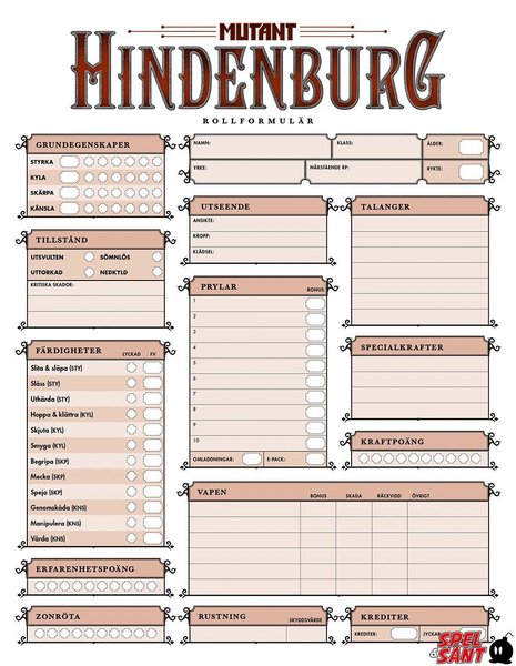 Slipp suddiga kopior och kladdiga utskrifter. Det officiella rollformulärsblocket till Mutant: Hindenburg innehåller 50 rollformulär, tryckta i fyrfärg.