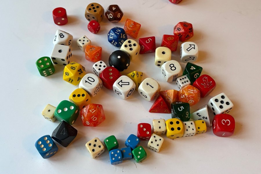 Blandade tärningar i olika färger och former. Mest T6. Men de flesta sorter finns med. Bland annat en rund ??