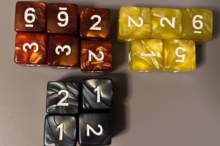 Set med tärningar, d6, 6 bruna, 5 gula och 4 svarta.