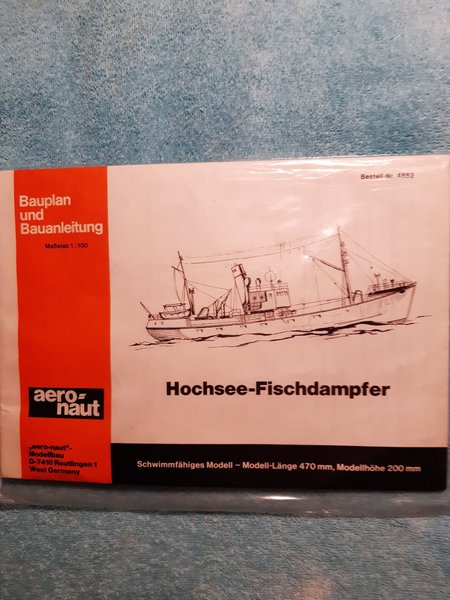 Ritning och instruktioner för en Aero-naut Hochsee-Fischdampfer modellbåt. Skala 1:100. Modellen är 470 mm lång och 200 mm hög.