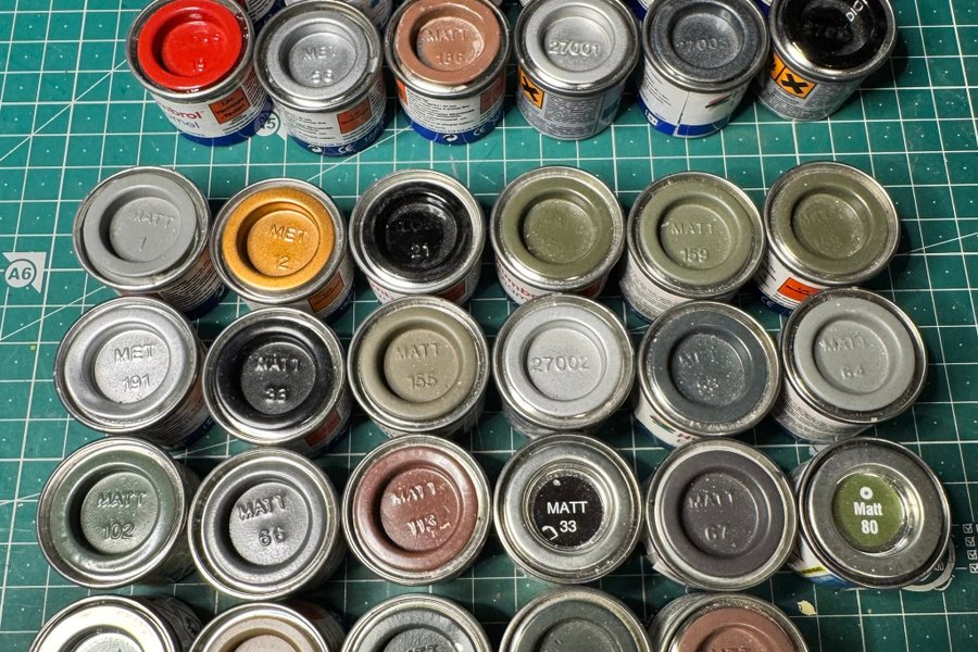 35 st. färger Humbrol. 23 st. i nedre fyra råder helt oanvända. Övre 12 st. öppnade 1-2 gånger, i övrigt mer än 75% kvar.