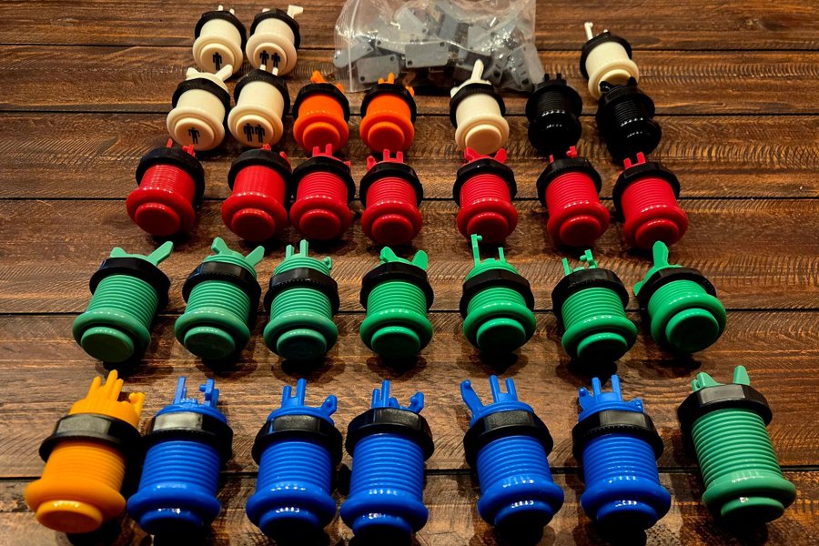 Set med arkadknappar i olika färger. Inkluderar vita knappar med en och två spelare, orange, röda, svarta, gröna och blå knappar. Perfekt för att bygga eller reparera arkadmaskiner. En påse med 25st microbrytare ingår. De flesta är aldrig använda, andra är sparsamt använda (nypris var 19kr styck). Skickas spårbart med postnord (84kr) eller hämtas på plats.