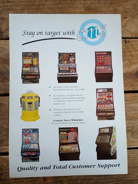 Flyer med information om olika spelmaskiner utvecklade av CMS. Innehåller bilder på modeller som Galaxy, Babge, Casinova Runner och Mystery. Broschyren beskriver företagets utveckling och tillverkning av spelmaskiner.