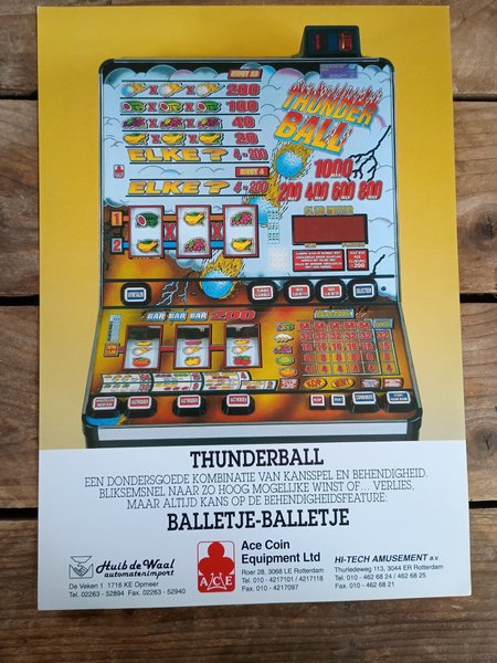Flyer avs. Thunderball spelautomat. Texten beskriver en kombination av chansspel och skicklighet, med snabba vinster eller förluster, men alltid med en chans på skicklighetsfunktionen. Annonsen nämner också "Balletje-Balletje".