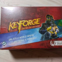 En oöppnad display innehållande 12 helt unika lekars från det allra första setet – Call of the Archons. Keyforge är ett kortspel skapat av Richard Garfield, mannen bakom Magic: The Gathering. Dessa kort produceras inte längre, och det blir allt svårare att hitta displays som fortfarande är inplastade.
