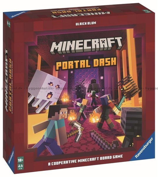 In the co-operative adventure game Minecraft: Portal Dash, players try to escape from Minecraft's fiery underworld, the Nether. You sprint through rugged landscapes full of magma and lava and have to prove yourself against dangerous monsters. Only if the players complete the portal in time and defeat its monstrous guardians can they survive the adventure together.On their turn, players use their equipment to perform two actions. They collect valuable blocks with pickaxes, move around the game board with boots, and use swords and bows to defend themselves against monsters. As the game progresses, they collect increasingly powerful equipment and equip themselves for the arduous adventure. To win the game together, players must traverse the rugged landscapes of the Nether maps and defeat the boss monster that awaits them at the end. On the way, it is important to collect the missing portal stones, which requires a large number of blocks. Players lose if they are late in delivering them or if the supply runs out of blocks. If a player's life points drop to zero, the team has also lost.—description from the publishe