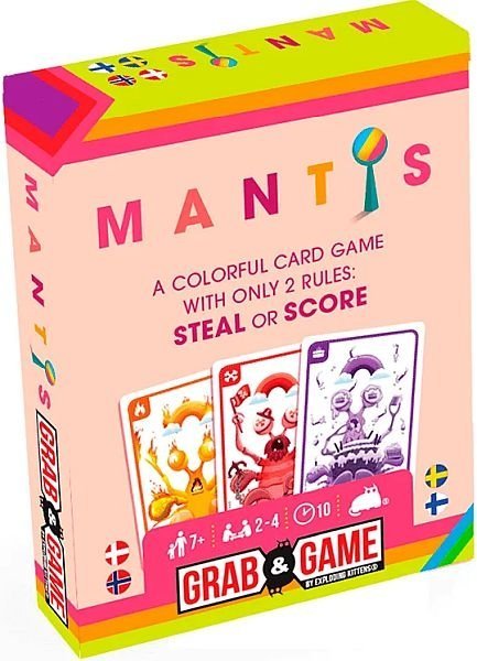 Mantis has only two rules: Steal or Score your way to victory. Collect matching cards by stealing or scoring until the winner has 10 cards in their score pile.