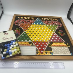 Ett schackbräde med tillhörande schackpjäser. Brädet kan vikas ihop för förvaring.