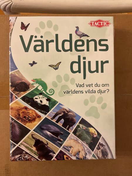 Brädspel från Tactic. Spelet heter Världens djur. Innehåller 200 djurkort, 6 världsdelar, världskarta och regler.