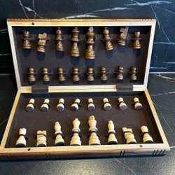 Storleken på brädet är 48 cm x 48 cm. Höjden på kungen är 12 cm. Väldigt fint skick och hög kvalitet material. Bädden är gjord av trä och pjäser är gjord av marmor sten . Totalt vikt ät runt 5 kg