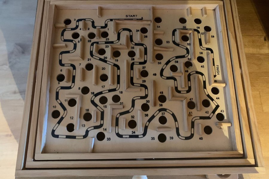 Trälabyrintspel med en kula som ska styras från start till mål genom en bana med hål. Spelet har numrerade sektioner längs banan.