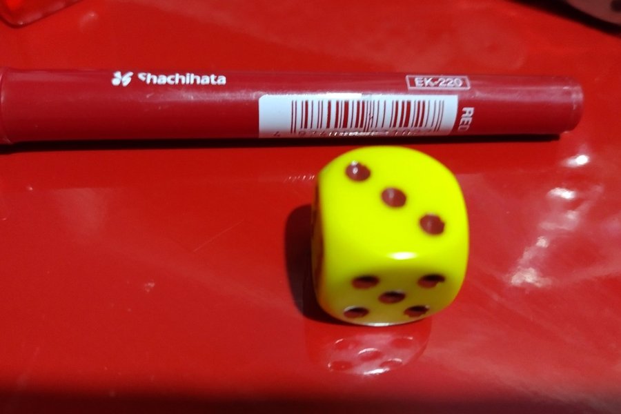 En gul tärning med röda prickar.