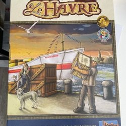 Board game with various game components including cards, tokens, and wooden pieces. The components are organized in plastic bags inside the game box.