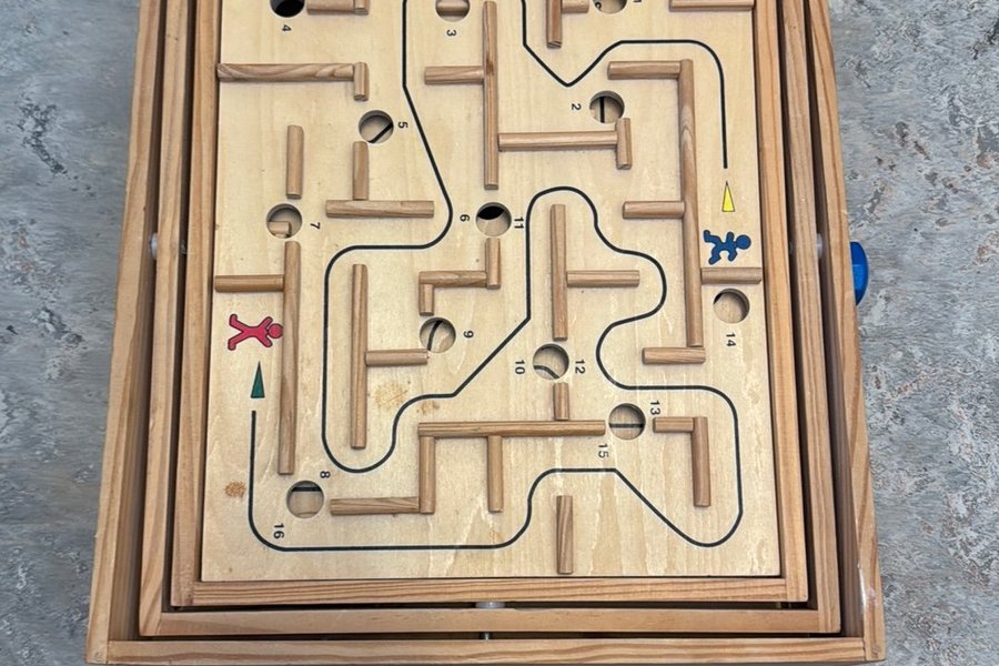 Trälabyrintspel med en bana och hål. Spelet har en röd startpunkt och en gul slutpunkt. Det finns siffror längs banan.