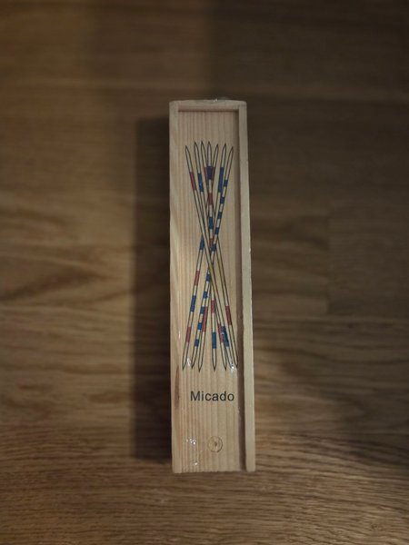 Micado spel i en träförpackning. Spelet innehåller pinnar med olika färgmarkeringar.