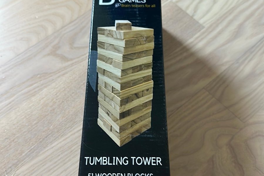 Tumbling Tower spel med 51 träklossar. Spelet går ut på att ta bort klossar från tornet utan att det rasar.