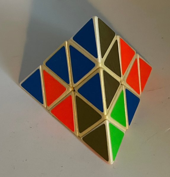 Föremålet på bilden är en Pyraminx, ett pussel i form av en tetraeder (tresidig pyramid) som liknar en Rubiks kub.