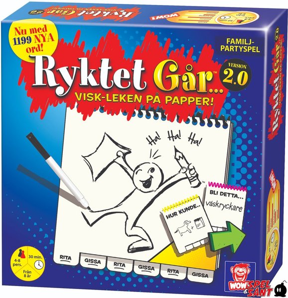 Äntligen en uppdatering av det omåttligt populära spelet Ryktet Går. Vi har ökat antalet ord med ca 50 %, och modifierat det så att det blivit ett bredare familjespel. Nu med 1199 nya ord och från 8 år! Rita vad du ser – gissa vad du såg – rita och gissa!
