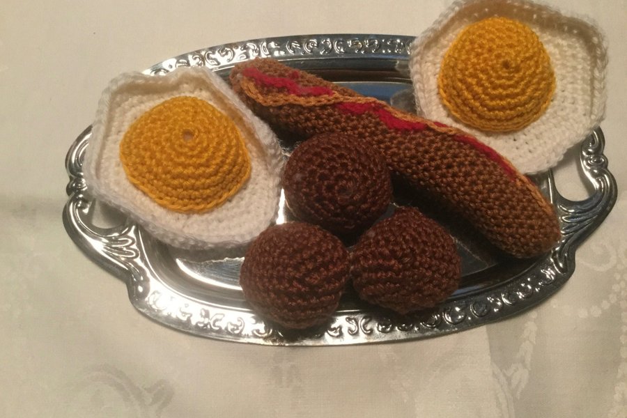 En korv, två stekta ägg och tre köttbullar. Dessa är virkade i bomullsgarn och fyllda med vadd.